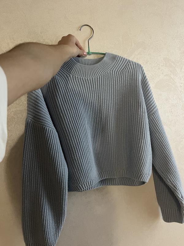 Довжина рукава 55 см, довжина торсу 45 см, 50 см. Тобто сам светр оверзайз, укорочений, та в самому магазині пише розмір М, хоча можна легко носити людям меншого розміру(ви це можете зрозуміти по замірам)