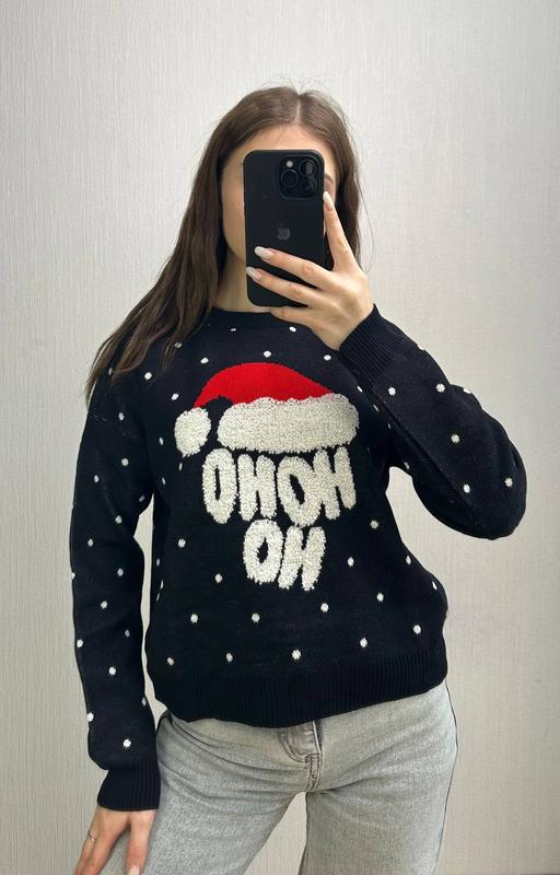 ❤️🔥Светр Ho-Ho-Ho 💫Артикул: 10565 😍Новогодний свитер - хороший вариант на подарок,или праздник 🪡Тканина:машинна вʼязка 🇹🇷Производитель: Турция ✏️Размеры: Универсал Параметры модели на фото Ог 85 талия 66 об 92 Размерная сетка: Ог 110 Длина 53 см Длина рукава 70 см