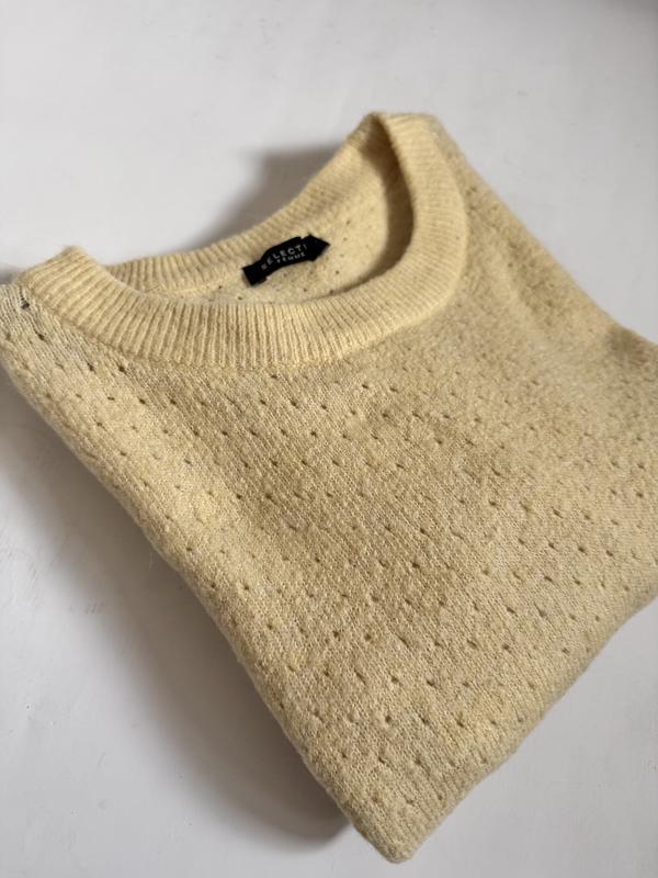 Светр ніжного кольору від Selected Femme Плече спущене, рукав 7/8 Розмір S, підійде і на М-L Склад: 25% вовна, 5% альпака, 40% акрил, 25% поліестер, 5% еластан Довжина - 55 см Напівобʼєм грудей - 50 см