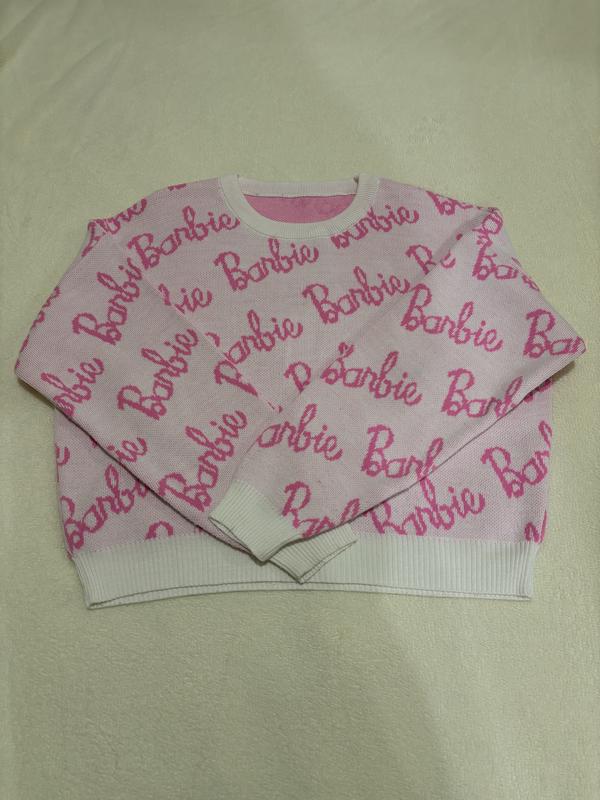 Рожевий трикотажний светр з повторюваним логотипом Barbie. Модель має круглий виріз, довгі рукави та еластичні манжети, низ і горловину в молочному кольорі. М’який і приємний до тіла матеріал забезпечує комфорт у повсякденному носінні. Розміри: Довжина виробу-48 см Напівширина-57 см Довжина рукава-44 см