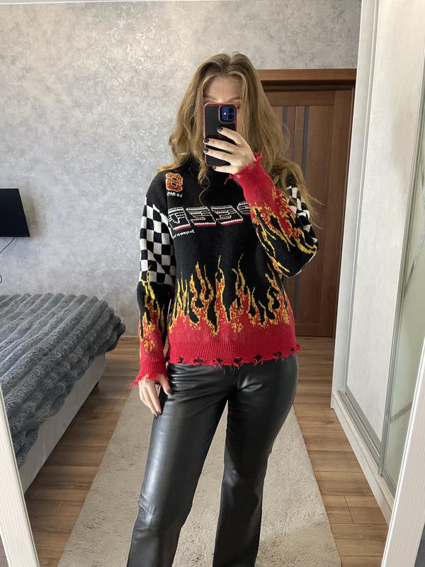 Рваний светр вʼязаний в стилі перегонів з принтом вогню shein жіночий