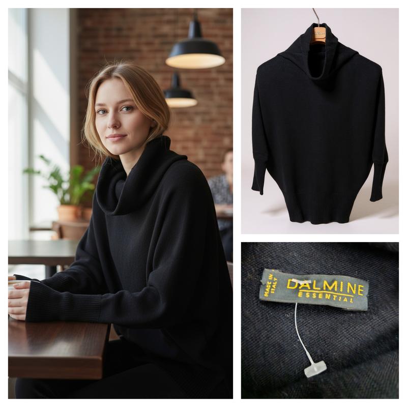 Dalmine essential, made in Italy шерстяной кашемировый свитер черного цвета. в идеальном состоянии внутренняя бирка со складом срезанная, на ощупь шерсть кашемир длина 68 пог 55