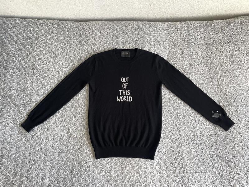 💙 Жіночий оригінальний легенький вовняний світер з принтом спереду Out of this world в перекладі означає фантастичний, у чорному кольорі, від дорогого Німецького бренду MARCUS LUPFER👄 💛 Приємний до тіла 💙 В нас на сайті ************ такий світер зі знижкою 6,695 грн 💛 Матеріал : 💯% Мериносова вовна • Декор (оздоблення) 💯% Пластик 💙 Зроблено в Китаї 💛 Розмір S-M Можна чистити в хімчистці 🧺 Прати вручну в холодній воді (делікатно) Використовувати м’який мийний засіб ❌ Не замочувати Надати форму поки виріб вологий Сушити в розкладеному вигляді (на горизонтальній поверхні) ❌ Не відбілювати ❌ Не сушити в сушильній машині Стан : Ідеальний без нюансів і дірочок Заміри :