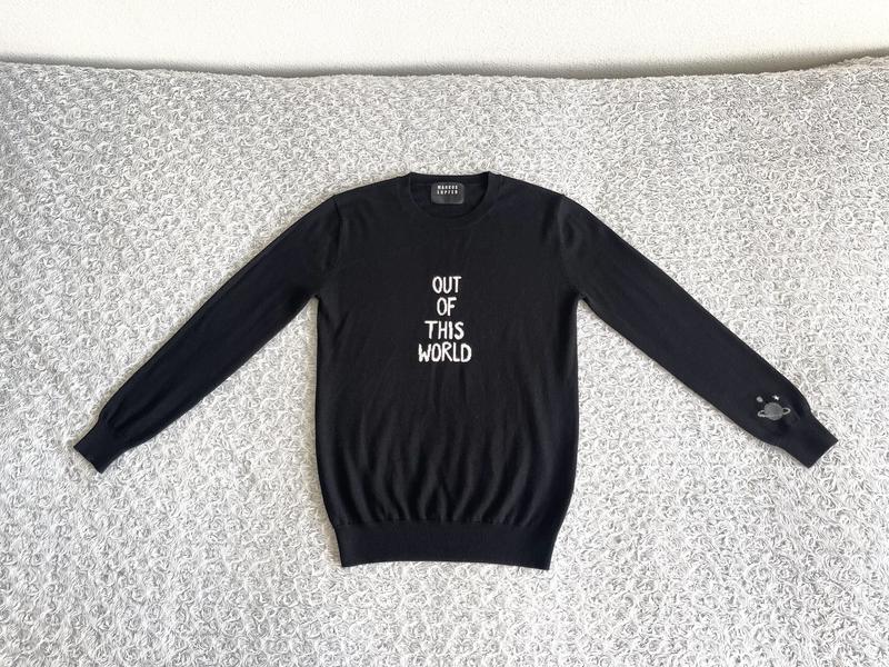 💙 Жіночий оригінальний легенький вовняний світер з принтом спереду Out of this world в перекладі означає фантастичний, у чорному кольорі, від дорогого Німецького бренду MARCUS LUPFER👄 💛 Приємний до тіла 💙 В нас на сайті такий світер зі знижкою 6,695 грн 💛 Матеріал : 💯% Мериносова вовна • Декор (оздоблення) 💯% Пластик 💙 Зроблено в Китаї 💛 Розмір S-M Можна чистити в хімчистці 🧺 Прати вручну в холодній воді (делікатно) Використовувати м’який мийний засіб ❌ Не замочувати Надати форму поки виріб вологий Сушити в розкладеному вигляді (на горизонтальній поверхні) ❌ Не відбілювати ❌ Не сушити в сушильній машині Стан : Ідеальний без нюансів і дірочок Заміри : Довжина по спині зверху до посадки 67 см • Довжина спереду зверху від горла до посадки 59 см • Груди 48 см • Плечі 41 см • Рукава від шиї до посадки 72 см • Рукава від плеча до посадки 60 см • Ширина виходу знизу 33 см при ослабленні, тягнеться до 59 см