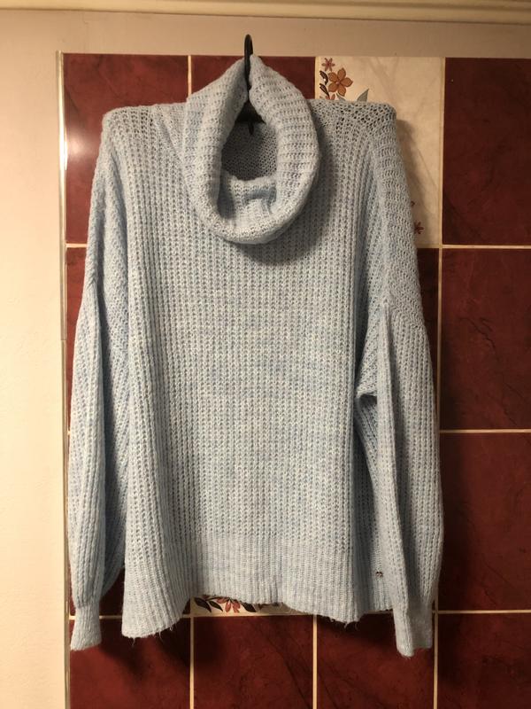 Дуже гарний блакитний светр з зручним коміром хомут. Тканина поліестер та полімід який дуже теплий , зараз ці тканини краще носяться ніж натуральні тканини і в них реально тепліше. Як що хочете можете загуглити Гарний рукав Він набагато краще в житті ніж на фото ног-75 до 90 низ-70 до 90 Довжина рукава від шиї 82 Довжина 70