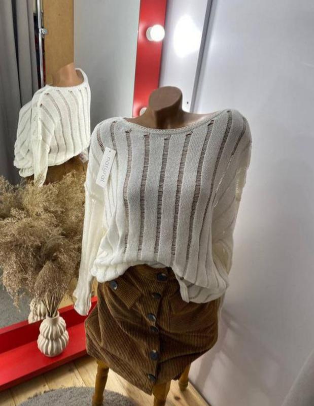 свитер имеет свободный крой (оверсайз), круглый вырез и длинные рукава. Его отличительная особенность – это ажурная, открытая вязка, что делает его полупрозрачным и идеально подходит для многослойных образов. размер универсален. состояние нового.