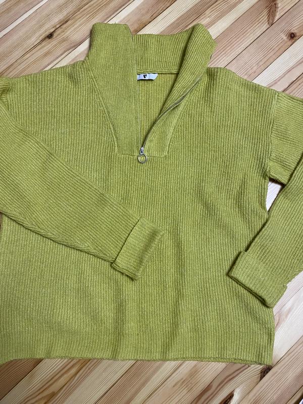 Тепленький світер, напівзамок, в жовто-гірчичному кольорі,півобʼєм грудей в вільному положенні 56, довжина рукава від шиї 73,піложений рукав пришито,довжина, довжина 64