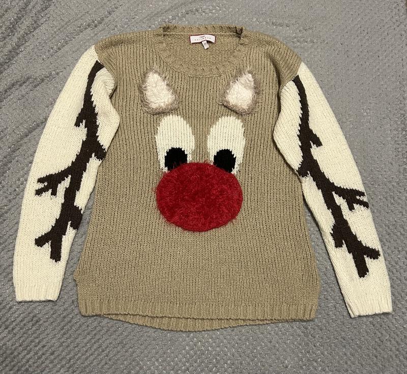 Светр новорічний, теплий , зручний . Заміри є на фото , на етикетці вказаний розмір 12, склад тканини 85% acrylic, 15 % wool.