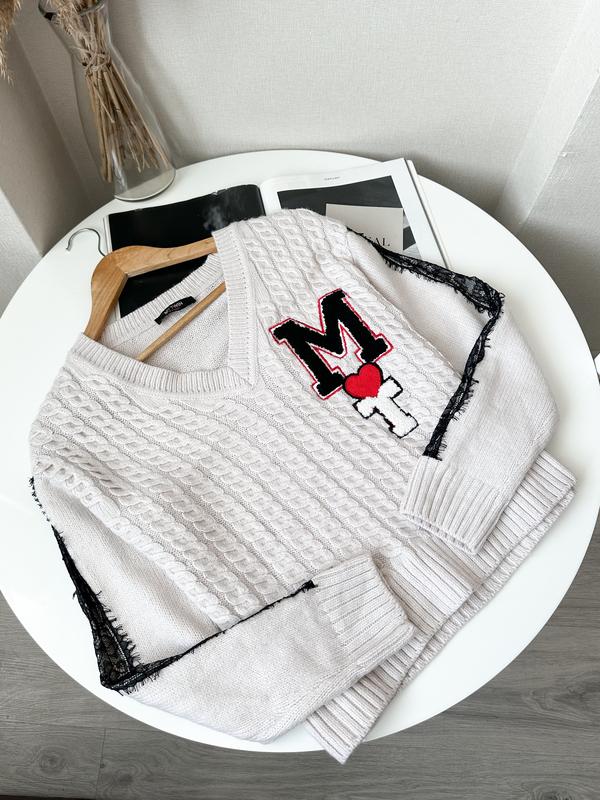Twin Set Молочний вʼязаний светр в коси з лого і мереживом на рукавах Стан гарний ――――――― розмір S/M по груди 56 по низу 58 рукав від горловини 72 довжина 56 ――――――― вовна/поліамід/акрил