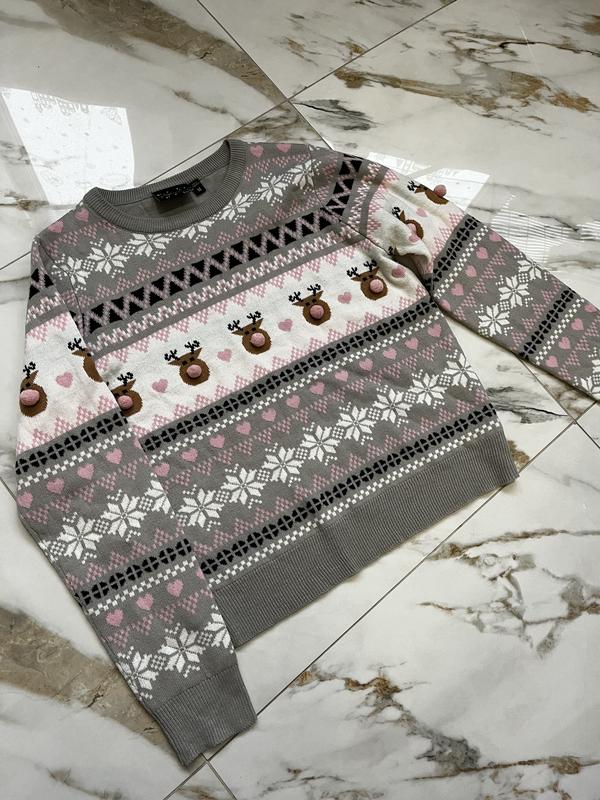 Гарний светр у світлі тони має декорування у вигляді оленів з носиками помпонами