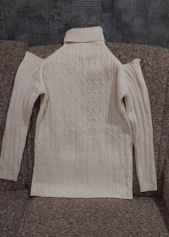 В идеальном состоянии. Вязаный женский свитер с высоким воротником и открытыми плечами кремового цвета бренда shein. Состав 100% акрил. Размер М(38). Замеры: грудная 46см, длина рукава до выреза 58см, длина по спине 70см.