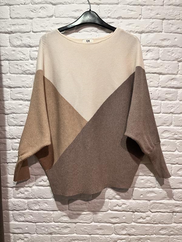 Светр із коміром-човником і рукавами типу «летюча миша», виконаний у стилі колор-блок із бежевого, світло-коричневого та темно-коричневого кольорів. Бренд C&A. Матеріал: Трикотаж у рубчик. Кольори: Бежевий, світло-коричневий та темно-коричневий. Підійде на розміри М, L. Без дефектів.