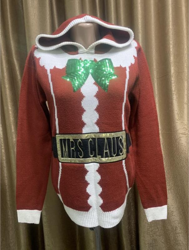 Новорічний светр світшот Next, з оригінальним принтом Санти, з глибоким капюшоном, з бубоном, паєтками, аплікацією Розмір S/8 Колір червоний, чорний, білий, зелений 100% акрил Довжина 64 см Плече 41 см Довжина рукава від плеча 67 см, від горловини 76 см Заміри без натягу та з натягуванням: Напівобхват грудей 48-58 см Напівобхват талії 46-56 см Напівобхват стегон 43-60см Склад: 100% акрил