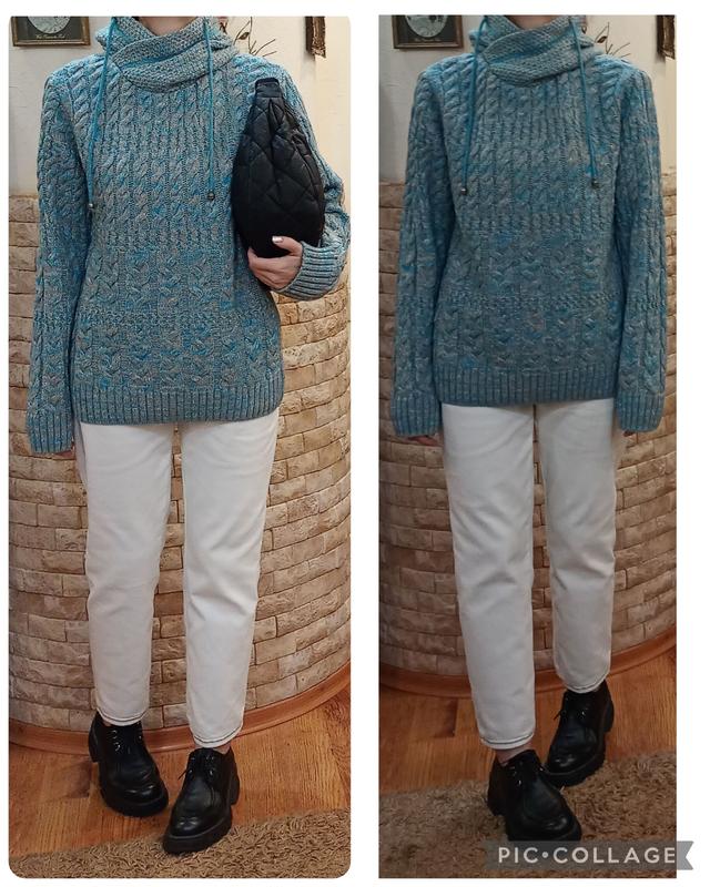 Свитер от турецкого бренда Trist Star. Модель прямого силуэта, freesize, с глухой воротником и капюшоном на стяжке. Благодаря стяжке есть несколько вариантов ношения воротника. Натуральная овечья шерсть - мягкая, приятная на ощупь и теплая. Цвет - меланжевый сине-голубой. Плетение с "косами". Размер - XL. Маломерит до размера L/M. Длина - 66 см. Длина рукава - 66 см. Ширина плечей - 42 см. Объем груди - 104 см. Объем талии - 104 см. Объем бёдер - 104 см. Состав - шерсть овечья (70%), полиамид (10%), акрил (20%). Страна производства - Турция. RRP (цена на сайте производителя) – 8200 грн. Белые брюки Massimo Dutti на фото - с моей страницы