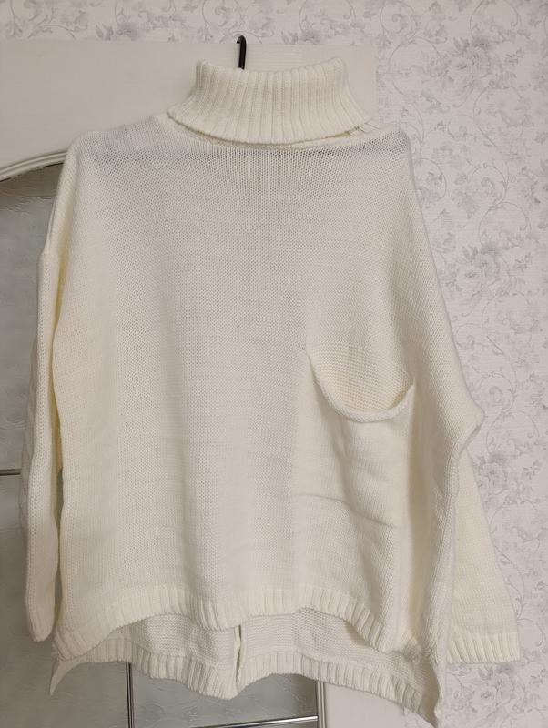 светр оверсайз, молочного кольору. Ни разу неадекватился. Подойдет на любую фигуру. Длина по переду 61см, сзади 67см, рукав приспущен, от горловины до конца рукава 66см, ПОГ 63см, высота воротника 2см.