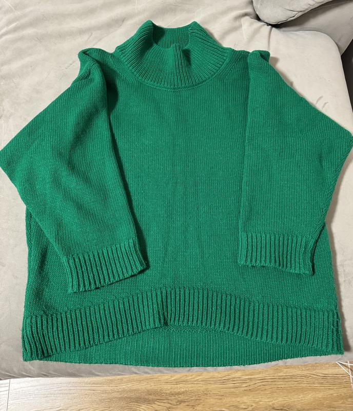 Зимовий светр, дуже красивий насичений зелений колір. Светр в гарному стані. Зауважень немає. Розмір S/M, він носиться як oversize. У даної моделі светра довжина спереду коротша, ніж ззаду. Теплий, приємна натуральна тканина.