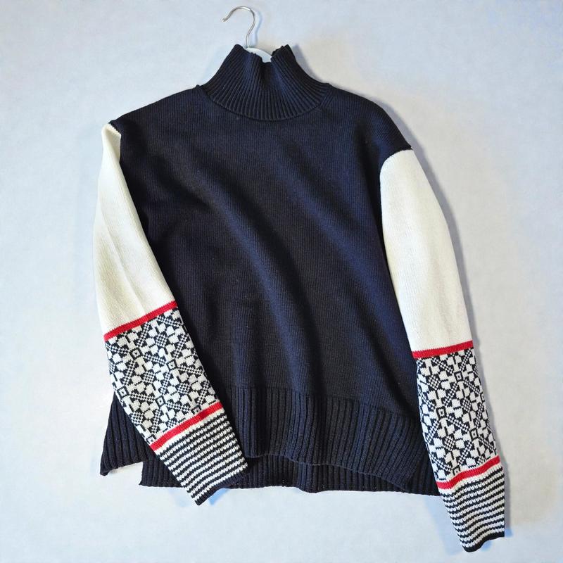 📢оплата на карту, есть возврат не оформляйте безопасную оплатку. вещи продаются на других платформах также Современный этно-минимализм Этот свитер производит впечатление тихой силы. О человеке, который знает, кто он есть, и не нуждается в лишнего декора. Свитер с высокой горловиной, сдержанный и в то же время очень характерный. Основной цвет - глубокий черный, матовый, благородный. Рукава - молочно-белые, что создает сильный графический контраст. Нижняя часть рукавов украшена геометрическим орнаментом, который напоминает традиционную украинскую вышивку. Тонкие красные полоски выступают в качестве акцентов – небольших, но эмоционально очень сильных. Манжеты - полосатые, плотные, держат форму. Силуэт прямой, немного свободный, без лишних деталей. Модель оверсайз. ЯПОНСЬКЕ ПЛЕЧЕ 100% меринос Zegna baruffa SUPERGEELONG ЗАМЕРЫ Д.61, ш.59, рукав 73 от горловины 📍В НАЯВНОСТІ knit.aesthetic связан в едином екз.