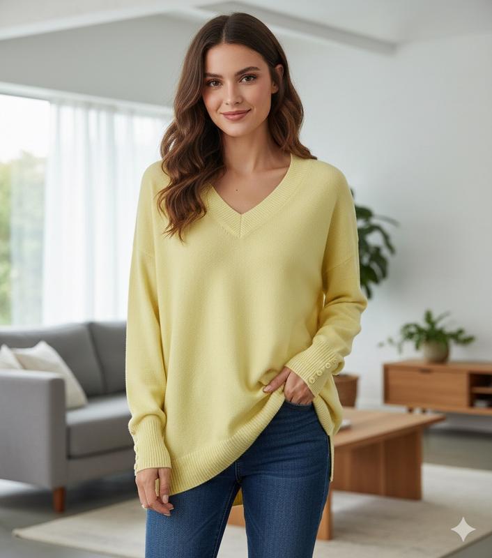 ЩЕ БІЛЬШЕ ГАРНИХ РЕЧЕЙ НА МОЇЙ СТОРІНЦІ! Підпишіться 🔥🔥🔥 Бренд: Fang Knitwear V-подібний виріз, вільний (оверсайз) крій. Декоративні гудзики на манжетах, асиметричний низ (ззаду довше, ніж попереду) Цей стиль популярний завдяки своїй універсальності та зручності, його можна носити як з джинсами, так і з формальнішими брюками Склад модал, віскоза, ангора, еластан Кольори жовтий, рожевий, чорний, білий Розмір: 54-56 ОГ 135 см Довжина спереду 66 см, по спинці 73 см