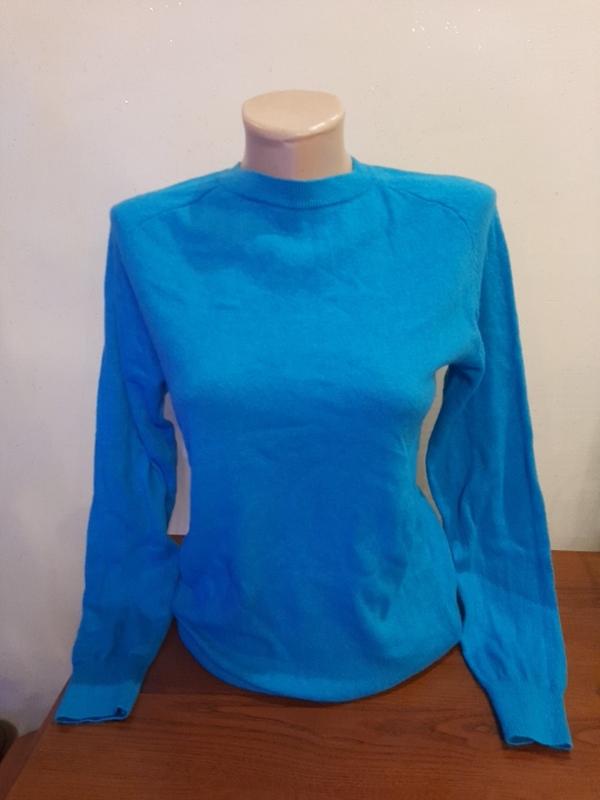 ZARA насыщенный бирюзово - голубой свитер, мягкий и нежный, не колется 5% кашемир, 29% шерсть, 30% вискоза, 36% полиамид Идеальное состояние Размер М длина от плеча - 64 полуобхват в груди -47 полу охват внизу-38 от горловины до конца рукава -72 Цвет как на фото 2