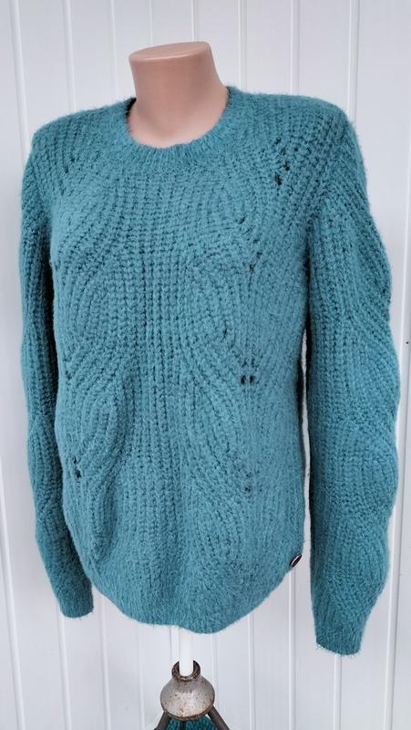 Очень красивый, стильный свитер, легкая ажурная вязка, пушистая нить "шиншила", состояние идеальное. Цвет морская волна, присущую очень красиво смотрится. По бирке размер М будет как оверсайз, по настройкам подходит на наш 50 размер