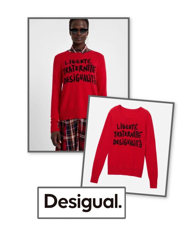 Червоний светр із характером Іронічний напис «Liberté • Fraternité • Désigualité» (Свобода • Братерство • Нерівність) — смілива гра зі змістами у стилі, який часто використовує Desigual. Про індивідуальність, свободу думок і легку провокацію. М’який, приємний до тіла трикотаж: 45% поліамід, 40% віскоза, 10% шерсть, 5% кашемір — комфортний, теплий і водночас легкий. Акцентний червоний колір, який не залишає байдужих. Річ для тих, хто любить одяг із меседжем і не боїться заявляти про себе. Розмір М Довжина 60 см У грудях ПО 50 см Рукава 60 см Стан ідеальний