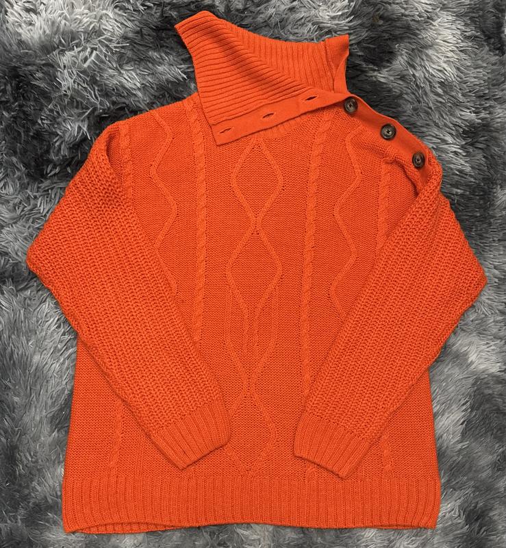 🍊 Яскравий помаранчевий светр Janina з фактурною в'язкою Додайте фарб у свій гардероб із цим стильним та затишним светром від бренду Janina. Насичений помаранчевий колір не лише підніме настрій, а й зробить ваш образ незабутнім. ✨ Особливості моделі: • Дизайн: Елегантна фактурна в'язка з візерунками "коси" та ромби. • Комір: Високий комір-стійка, що трансформується завдяки стильним ґудзикам на плечі — можна носити як закритим, так і у розслабленому вигляді. • Колір: Соковитий гарбузовий / помаранчевий. • Склад: 100% акрил (Polyacrylic) — м'який на дотик, не колеться і добре зберігає тепло. 📏 Розмір та деталі: • Розмір: EUR 44 / IT 48 / FR 46 (відповідає XL або вільному L). • Бренд: Janina. • Декор: Чотири великі контрастні ґудзики на лівому плечі, які додають особливого шарму. • Стан: Відмінний, в'язка рівна, колір насичений. Всі бірки на фото, фото на собі не роблю. 📩 Для замовлення або отримання додаткових замірів — пишіть у приватні повідомлення!