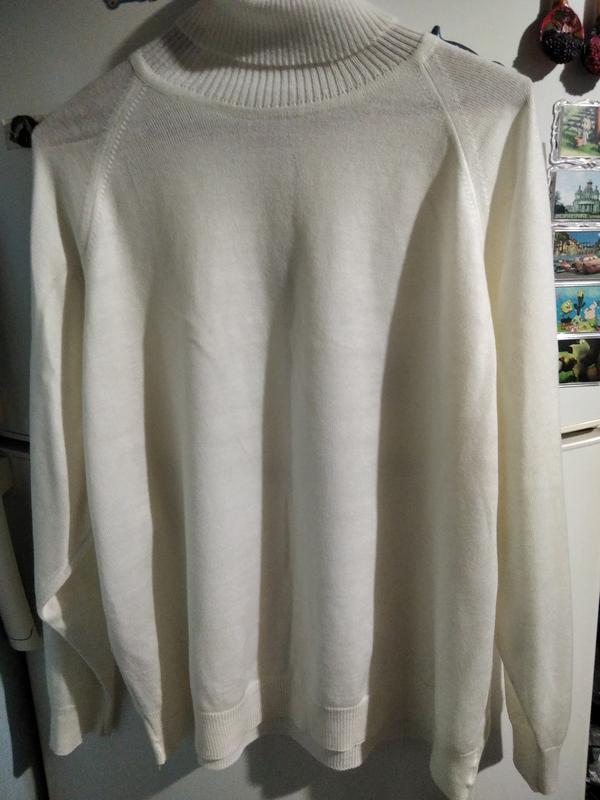 Свитер батал, молочного цвета в идеальном состоянии. Бирки отсутствуют. Приятный на ощупь и к телу. ОГ 138-160 ОБ 132-160 Длина 63. Рукав 75 от горловины. Обладает хорошей эластичностью. Не толстый. Девочки, 76 всех, сами заказы не оформляйте!!