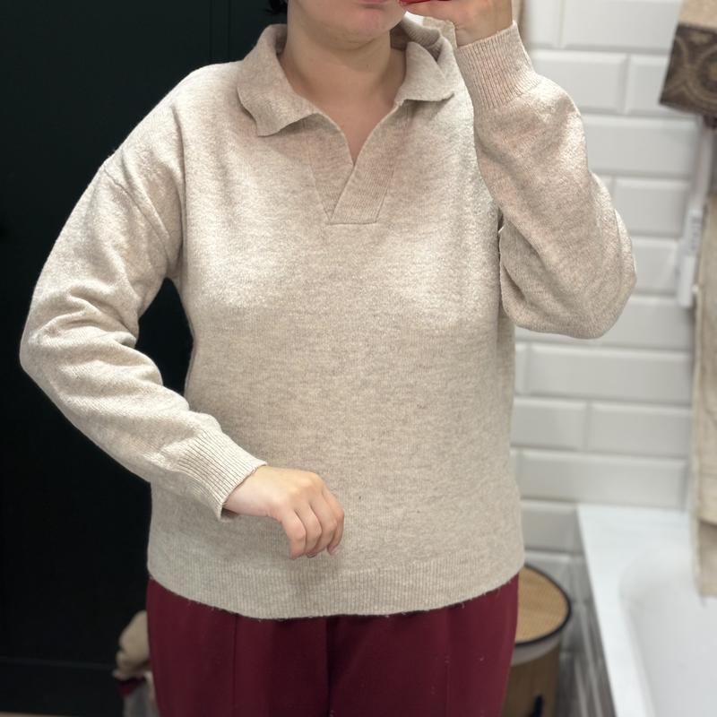 Легенький светрик базовий. Одягала декілька разів, лежить без діла. Дуже мягенький і приємний. Груді 120-125 буде гарно.