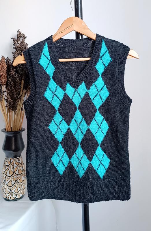 женская тёпленькая безрукавка черного цвета с ярко-голубыми ромбиками бирочки с указанным размером нет, поэтому ориентируйтесь по замерам ПОГ 42 см тянется до 52 см ПОТ 42 см низ 40 см тянется до 58 см длина 59 см бирочки с значением состава ткани нет по ощущению шерсть ткань хорошо тянется
