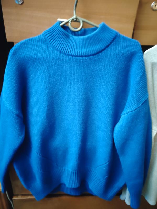 Этот синий вязаный свитер имеет высокий воротник-стойку и интересные декоративные швы, Он выполнен крупной вязкой и имеет свободный крой и заниженные плечевые швы,пятн никаких не существует, не выгорает, это камера шось так зафиксировала,ог56-62 тянется; длина с переда 49 с удушью56, кофей от воротничка 67, работаю с полной оплатой на карту уже не первый год 💙💛