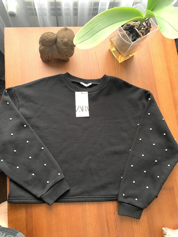Оверсайз кофта-світшот на флісі, дещо вкорочена і досить тепла на S-M. Рукава оздоблені камінцями.