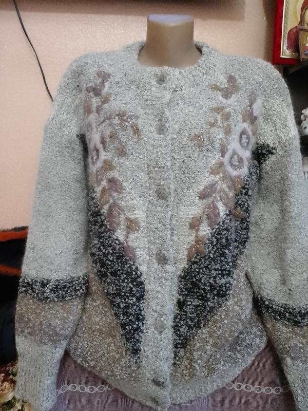 Кофточка серого цвета с серебристой нитью размер 52-54.Спереди цветы.Есть подкладка по всей кофте и рукава тоже. Букле. Оплата на карту.Без возврата.