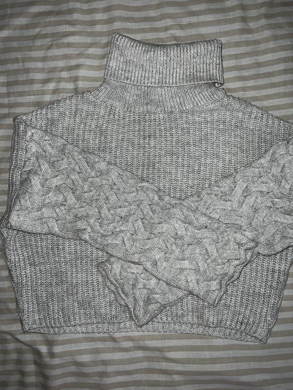 укорочений светр із високим коміром сірого кольору з візерунком коса на рукавах. Оверсайз.