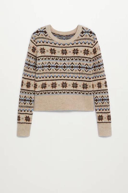 Джемпер с жаккардовым узором от бренда Mango. Он выполнен в стиле Fair Isle (норвежский узор) в бежевых, коричневых и синих тонах. Кроп-топ (укорочений дизайн) Круглый вырез, длинные рукава и жаккардовый узор Fair Isle Содержит смесь акрила, полиэстера, полиамида и шерсти.