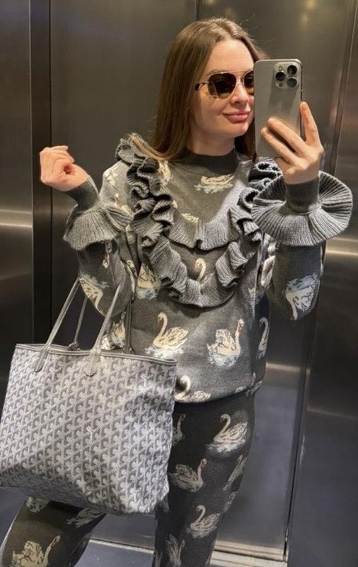 Брендовий костюм . Відмінний стан . Светр : довжина 66 см , рукав 60 см , спина 44 см , пів обхват грудей 52 см . Штани : довжина 108 см , пів обхват талії 32 см .