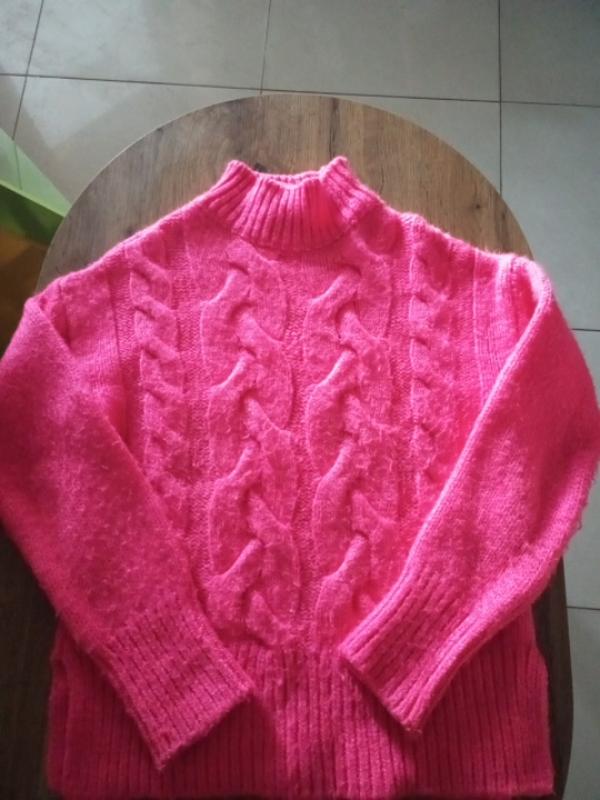 красивый розовый свитер под горлышки. по бокам разрезы. подойдет и на с.м. тянется и на с.м