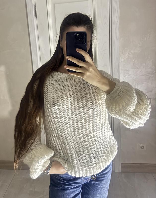 Білий вʼязаний светр з обʼємними рукавами українського бренду Krisstel 50% шерсть 50% акрил Вдягався один раз Оверсайз, але приталений знизу
