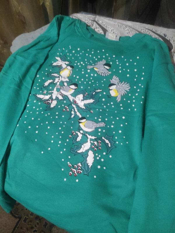 Велика гарна мягка кофтинка Легкая и с утеплением ог 76*2 длина 70 по бокам 74 имитация растянутых сторон спущенное плечо, от шеи 81 эсть катышки,но она Новая. Для сна,чи на выход,гарная аппликация под нее есть спортивные смотрите Мои объятия!