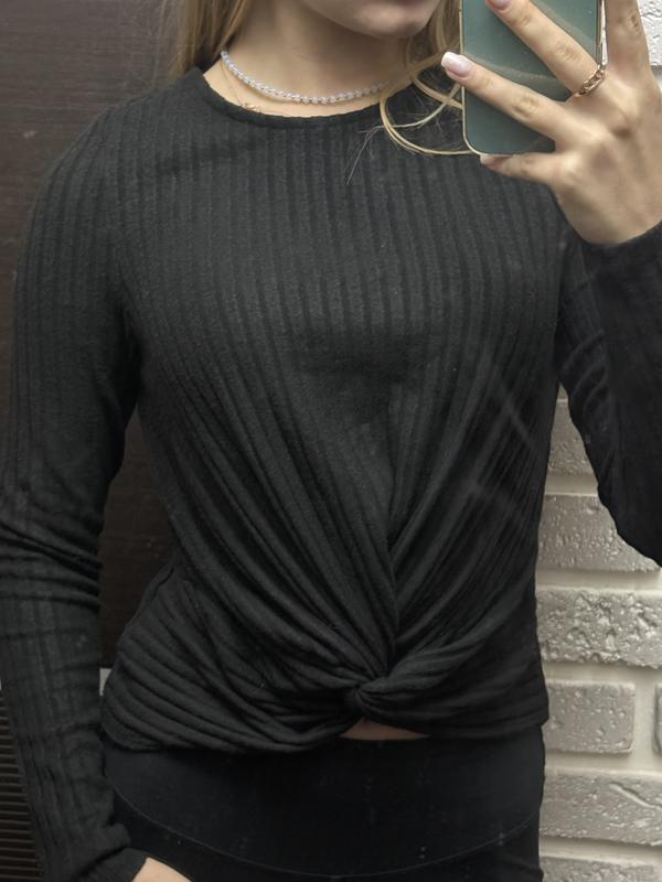 Чорний лонгслів з вузлом в рубчик, приємний до тіла. Пів ОБ: 38см Довжина лонгу: 48см Довжина рукава: 60 см