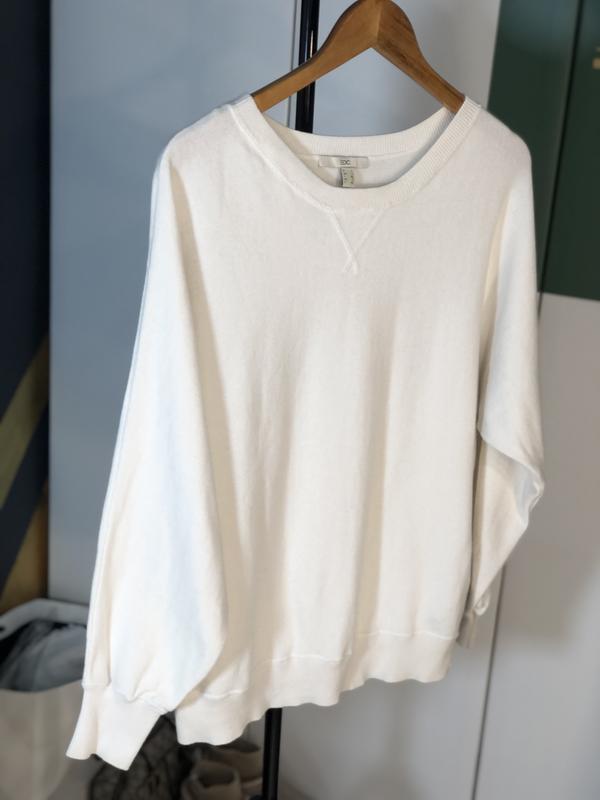 Довжина 65 Груди вільно Підмишка спущена Під грудьми 59 Низ 42 Заміри без натягнення. Гарно тягнеться Склад бавовна . Колір молочний Рукав вільний на манжеті По бокам шви Стильний базовий джемпер