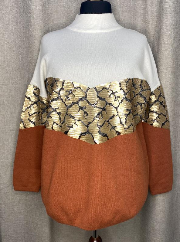 Женская удлиненная кофточка (или туника) в бело - оранжевом кольре с пайетками по середине. Качество приятное к телу. Подойдет на размер XL-XXL По замерам воспользуйтесь)