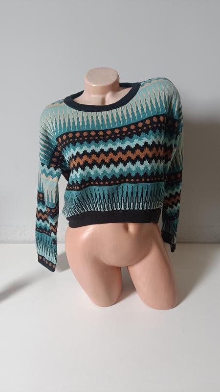 Яркий свитер, с геометрическим орнаментом. Мягкий,комфортный, яркий и стильный, спереди модель немного укорочена. Оверсайз, Замеры есть на фото. Размер С-М