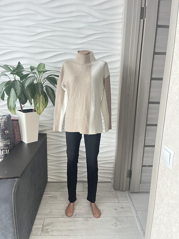 Жіноча в’язана кофта у ніжних бежево-молочних відтінках. Модель з високим коміром-гольфом, прямого крою. Довгий рукав, низ і манжети виконані резинкою. М’яка, тепла та приємна до тіла, добре тримає форму. Універсальний варіант для повсякденних образів. Стан дуже гарний.