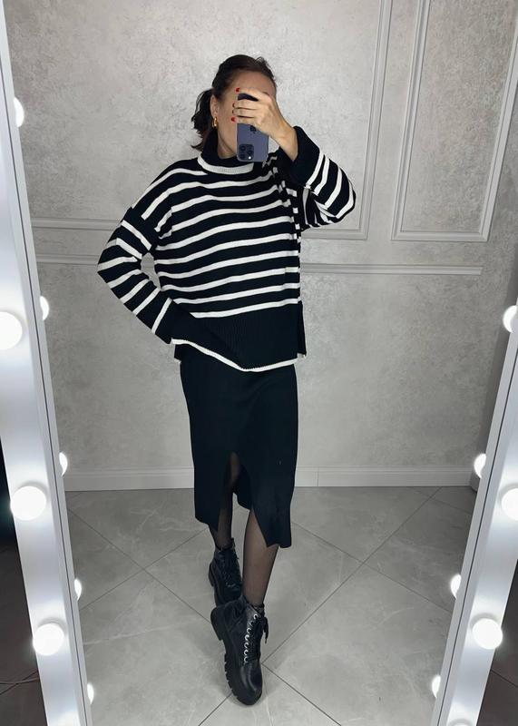 Светр Модель 7002 Размер универсальный 46/58 Цена 750грн Машинная вязка Производитель Турция 🇹🇷 Стильный и невероятно уютный свитер, подойдет под разные образы. Черно-белый цвет всегда в моде. Цвета: белый с черной полоской и черный с белой полоской. Замеры: ОГ-68 см Длина-60 см Длина рукава от ворота-73 см