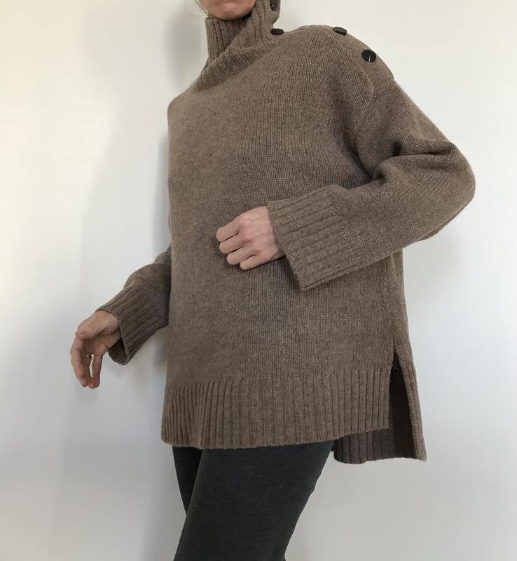 Светр оверсайз від бренда Second female. Актуальний фасон, високий комір, гудзики на комірі можна розстібнути. Дуже гарний склад, 60% вовни мериноса, 20% вовни яка, 20% поліаміда, светр дуже ніжний, не колеться. Розмір S, на фото вдягнено на зріст 162, розмір S. За рахунок вільного подовженого крою сожна іна xs, m. Стан дуже хороший, на рукаві є зашите місце, зазначено на фото, в носці непомітно. Заміри Довжина позаду 63 Рукав від коміра 63 Плечі 59 Підпахви 61 Ширина внизу 62