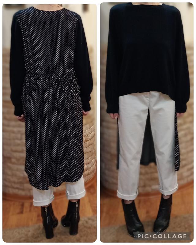 Свитер невероятно интересного кроя в стилистике коллекций COS - асимметрия, оригинальное решение, сочетание тканей различной фактуры и цвета. Лаконичный базовый, freesize однотонный перед из вязаного плотного трикотажа, достоверно из добавления шерсти. Утрированно длинный рукав, спущенное плечо. Спинка удлиненная по типу фрака, эластичная талия, чехол. Ткань - шелковистая вискоза темно-синего цвета с принтом в белый горошек. Размер - M, L. Длина переда - 62 см. Длина спинки - 110 см. Длина рукава - 57 см. Ширина плечей - 54 см. Объем груди - 110 см. Об'єм по низу - 100 см.