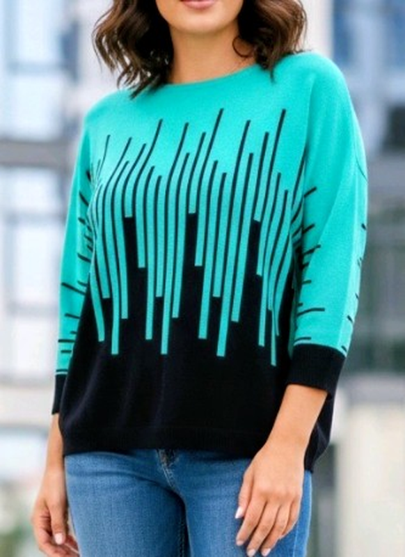 Свитер женский, состав трикотажа на фото. Цвет комбинированный бирюзовый с черным. Размер один на 54-56 Замеры: ширина в груди- 58см, длина-63см. Рукав вместе с плечом- 60см. Пересылаю после оплаты на карточку или безопасной оплатой.