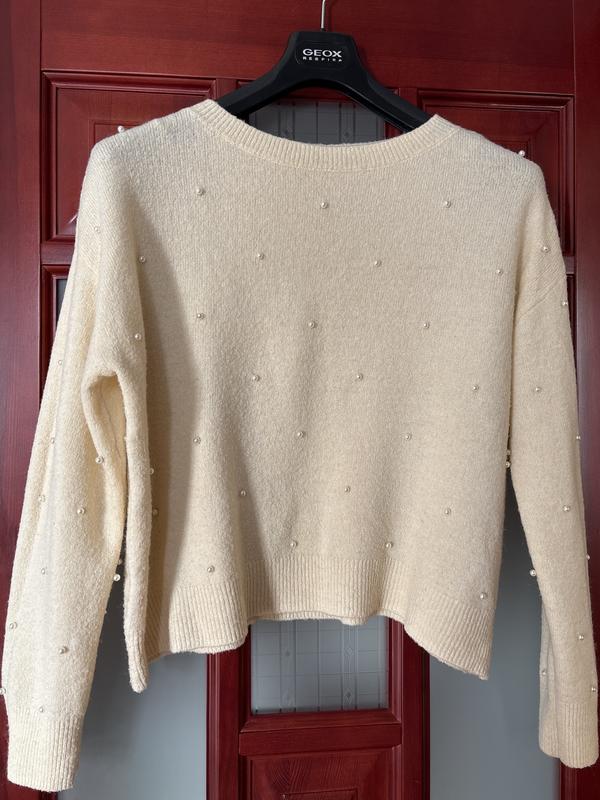 Светр молочний, вершковий, кремовий. Прикрашений перлинами, вони всі на місці . На фото видно нюанс на спині, смужка коли був складений залишилася. Довжина 60, пог 70, пос 70, плече 18, рукав 57. Стан ідеальний