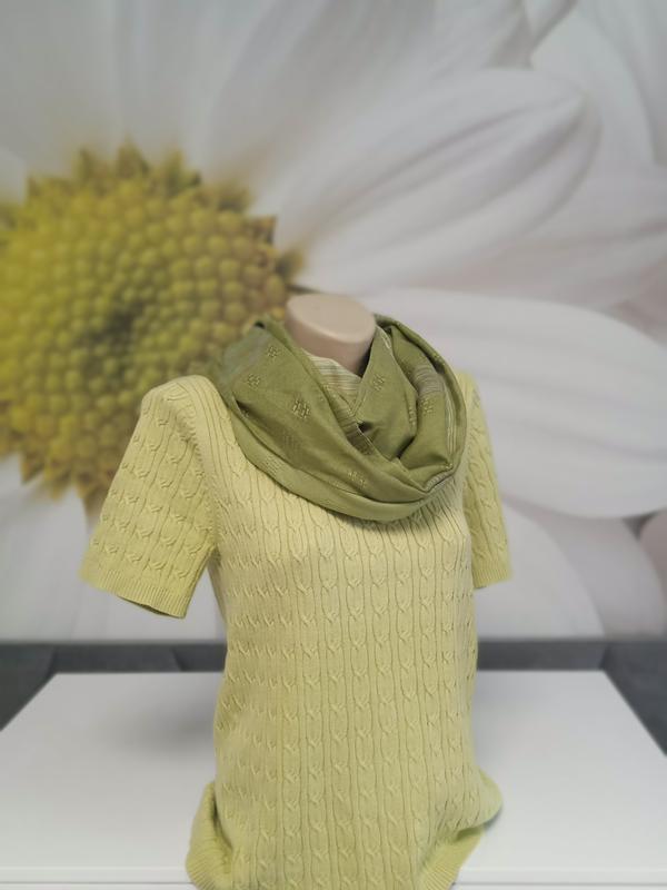 Классическая однотонная кофтонка с коротким рукавом светло салатового цвета. Теплая и комфортная. Приятная на ощупь. Фактурная машинная вязка. Нить средней толщины. Стрейч. Фасон прямой. Ложится по фигуре. Аккуратный вырез, украшенный пуговицами. Красиво смотрится с шарфом в тон в комплекте (шарф может быть заменен, но в цвете). Есть размеры. 38р на пог-48-50 36р на пог-46-48 34р на пог-44-46