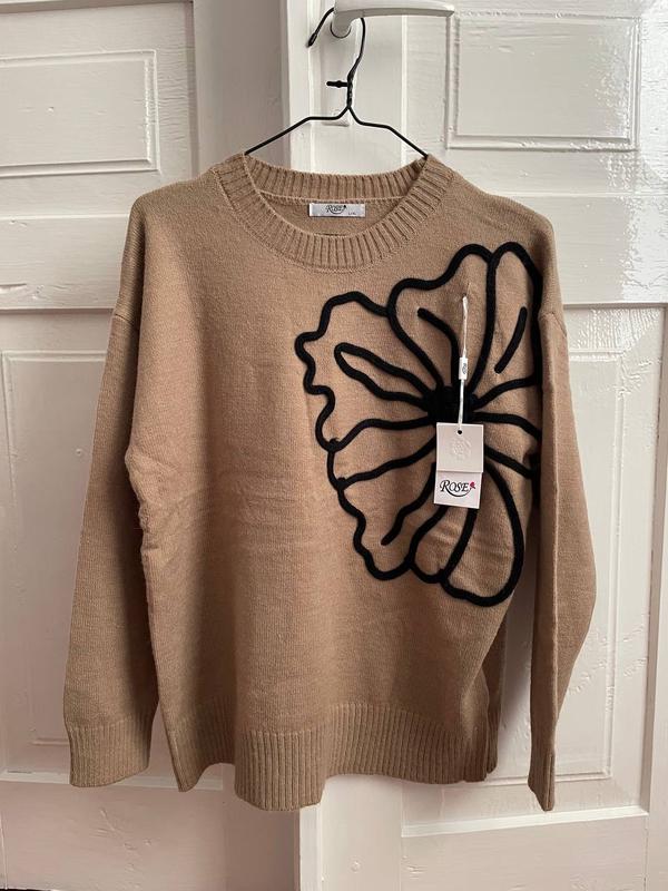 Кофта коричнева з вмістом шерсті 25%. Розмір L-XL (48-52). Обʼєм грудей 106 см, Довжина рукава 48 см Довжина кофти 65 см Нашитий чорними нитками візерунок. Нова з етикеткою.